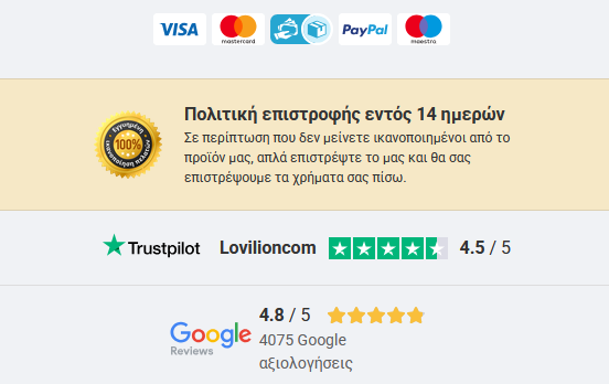 Η αποστολή γίνεται μέσω των Ελληνικών Ταχυδρομείων (ΕΛΤΑ). Θα ενημερωθείτε με SMS και τηλεφωνικά πριν από την παράδοση. Μπορείτε να πληρώσετε με μετρητά ή κάρτα. Εάν έχετε ήδη πληρώσει για το προϊόν, δεν χρειάζεται να πληρώσετε ξανά. Θα βρείτε ειδοποίηση για την αποστολή στο γραμματοκιβώτιό σας. Εάν το προϊόν δεν ανταποκρίνεται στις προσδοκίες σας, μπορείτε να το επιστρέψετε εντός 14 ημερών χωρίς να δηλώσετε λόγο. Επιστρέψτε το αχρησιμοποίητο προϊόν στην αρχική του συσκευασία μαζί με τη συμπληρωμένη φόρμα επιστροφής/αίτησης αλλαγής. Θα σας επιστρέψουμε τα χρήματα ή θα σας στείλουμε άλλο προϊόν ίσης αξίας χωρίς επιπλέον κόστος. Έτσι διασφαλίζουμε την ικανοποίηση των σταθερών πελατών μας.
